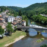 Aire située en bordure de la rivière Aveyron, chemin de St Cambraire GR36, à 500m des commerces de proximité